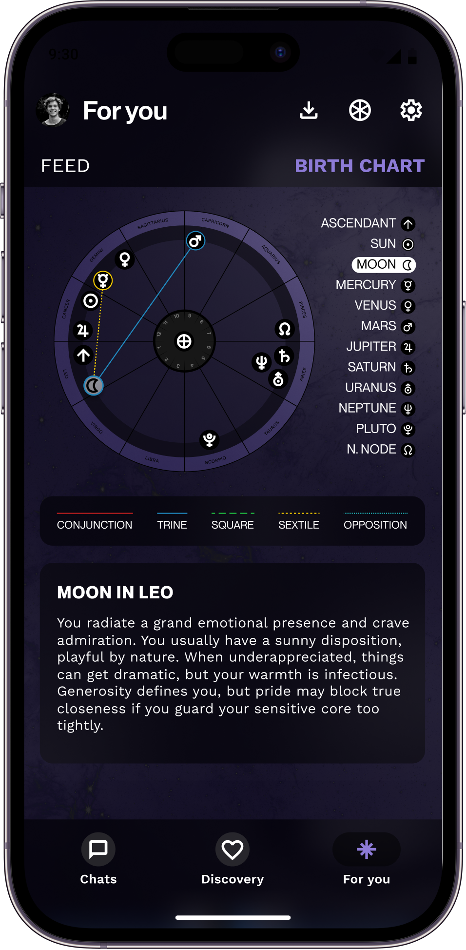 Our algorithm creates an interactive birth chart and tailor-made profile for you, showcasing your true essence and energy, while communicating your values and needs in relationships. Stars Align also tracks the current planetary positions so that you are in-the-know about your cycles and timing around dating.